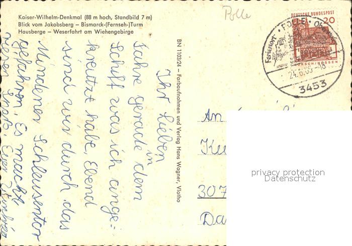 72332292 alte Postkarte Porta Westfalica Kaiser Wilhelm Denkmal Blick vom Jakobsberg Bismarckturm Hausberge Weserfahrt Wiehengebirge postalisch gelaufen Erhaltung siehe scans KatCode: 11110005770032