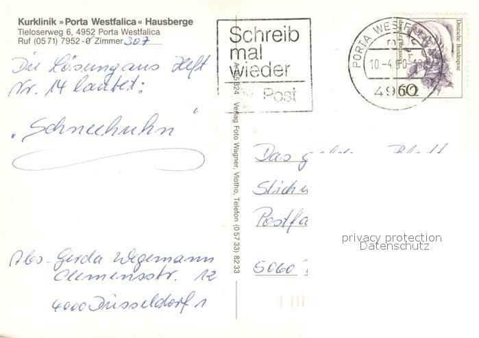 73649355 alte Postkarte Porta Westfalica Kurklinik Porta Westfalica Hausberge Sporthalle Lesezimmer Hallenbad Wassertreten Zimmer Kegelbahn postalisch gelaufen Erhaltung siehe scans [WerneD78] KatCode: 11110005770032