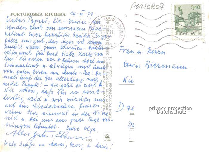 74157642 old postcard Portorose Portoroz Piran Istrien Slovenia Portorož-Riviera Strand Meer Pier Hotels Bucht Promenade Segelboote postalisch gelaufen Erhaltung siehe scans [Karloger] KatCode: 11500