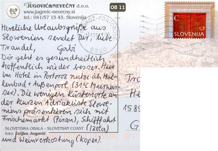 old postcard Portoroz Portorose Piran Istrien Slovenia Piran Koper Izola Panorama slovenische Kuestenstaedte postalisch gelaufen Fliegeraufnahme Erhaltung siehe scans [FriedD77]