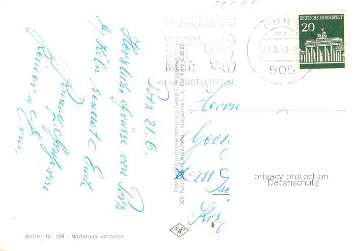 73858342 Porz Koeln Rhein Kirche Luftbild Hauptstrasse Bahnhofstrasse postalisch gelaufen Erhaltung siehe scans [FriedD77] alte Postkarte Frie Katcode 11110005315000