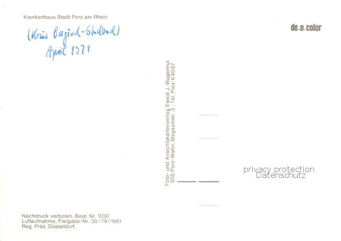 73865079 Porz Koeln Rhein Krankenhaus postalisch nicht gelaufen Fliegeraufnahme Erhaltung siehe scans [FriedD77] Fliegeraufnahme Frie Katcode 11110005315000