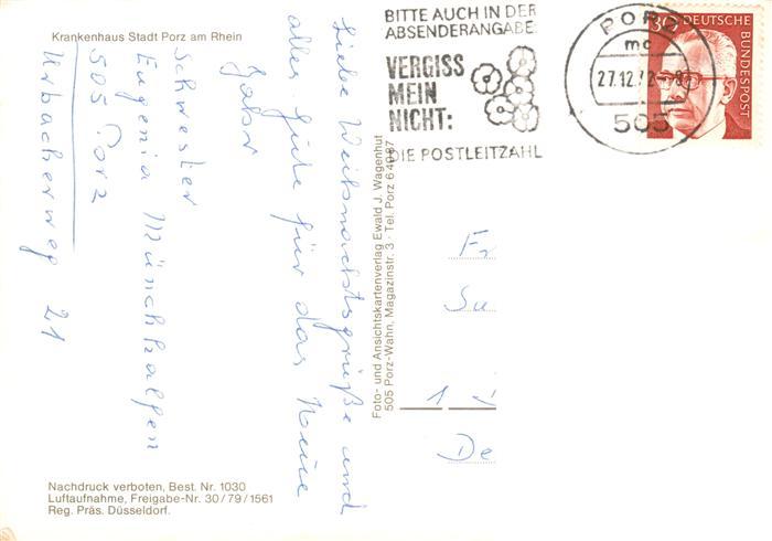 73924887 Porz Koeln Rhein Krankenhaus Stadt Porz Fliegeraufnahme postalisch gelaufen Erhaltung siehe scans [WerneD78] alte Postkarte Wern Katcode 11110005315000