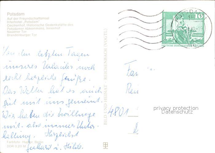 72374268 alte Postkarte Potsdam Freundschaftsinsel Interhotel Potsdam Cecilienhof Historische Gedenkstaette Nauener Tor Brandenburger Tor postalisch gelaufen Erhaltung siehe scans KatCode: 11110012054000