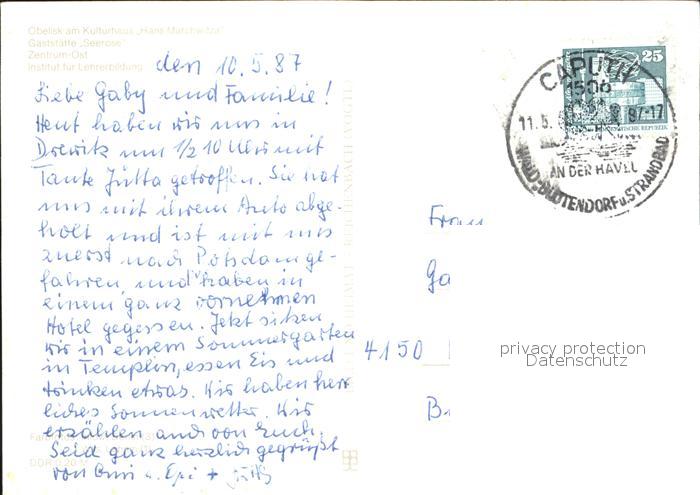 72370900 alte Postkarte Potsdam Gaststaette Seerose Obelisk am Kulturhaus Hans Marchwitza postalisch gelaufen Erhaltung siehe scans KatCode: 11110012054000