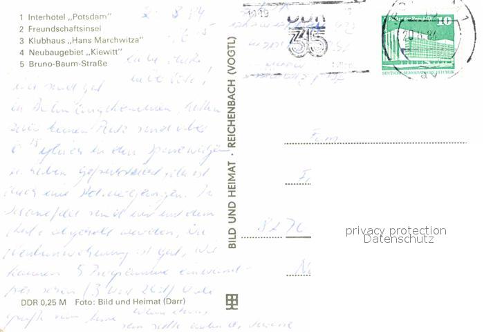 72633029 alte Postkarte Potsdam Interhotel Potsdam Freundschaftsinsel Klubhaus Hans Marchwitza Neubaugebiet Kiewitt Bruno Baum Strasse postalisch gelaufen Erhaltung siehe scans [FriedD77] KatCode: 11110012054000
