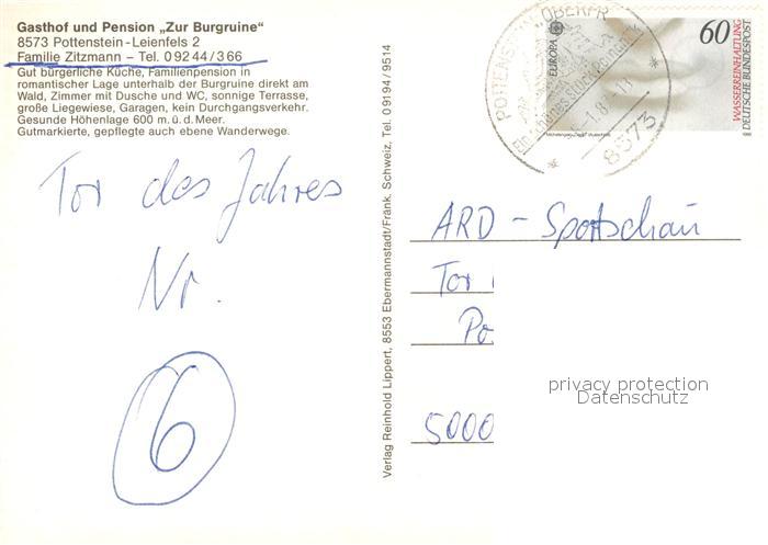 73332166 alte Postkarte Pottenstein Oberfranken Gasthaus Pension Zur Burgruine postalisch gelaufen Erhaltung siehe scans [LiesaD40] KatCode: 11110009472179
