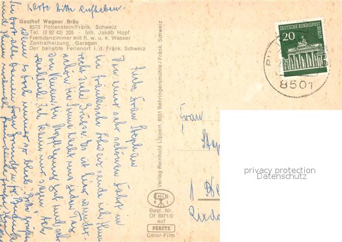 73107181 alte Postkarte Pottenstein Oberfranken Gasthaus Wagner Braeu postalisch gelaufen Erhaltung siehe scans [KathaD81] KatCode: 11110009472179