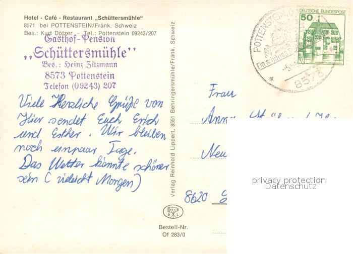 73712153 alte Postkarte Pottenstein Oberfranken Hotel Cafe Restaurant Schuettersmuehle postalisch gelaufen Erhaltung siehe scans [WerneD78] KatCode: 11110009472179