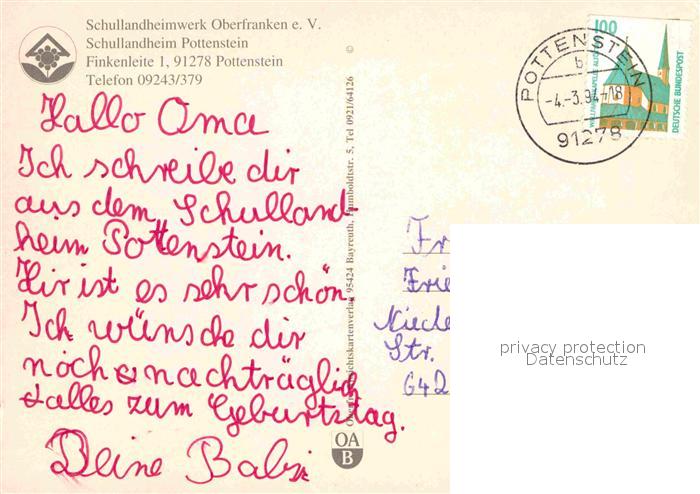 72784744 alte Postkarte Pottenstein Oberfranken Schullandheim postalisch gelaufen Erhaltung siehe scans [LiesaD40] KatCode: 11110009472179