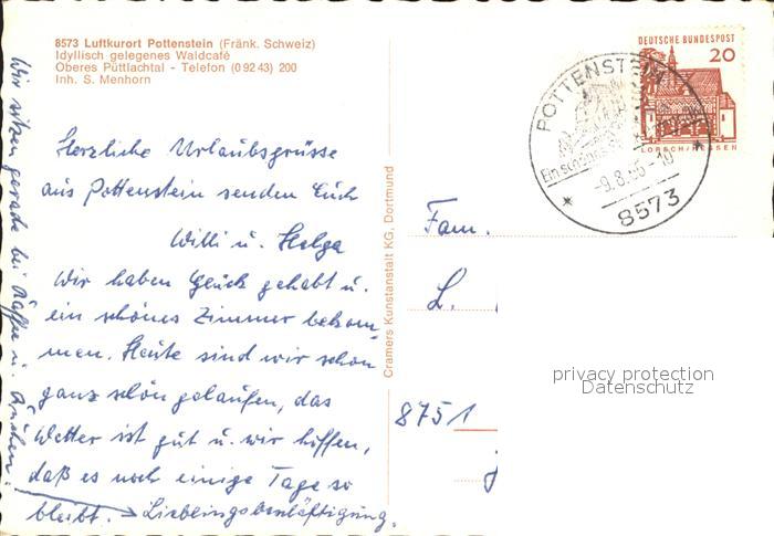 72257370 alte Postkarte Pottenstein Oberfranken WaldCafe Oberes Puttlachtal postalisch gelaufen Erhaltung siehe scans KatCode: 11110009472179