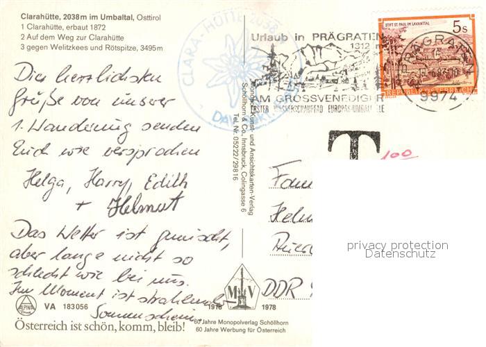 73363799 alte Postkarte Praegraten Grossvenediger Clarahuette im Umbaltal Almvieh Alpenflora Edelweiss Alpenpanorama postalisch gelaufen Erhaltung siehe scans [FriedD77] KatCode: 11390333070723