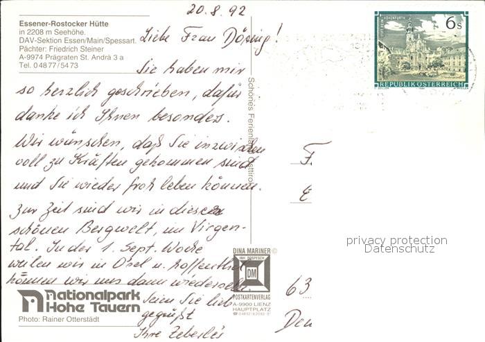 72498922 alte Postkarte Praegraten Grossvenediger Essener Rotstocker Huette Simony See postalisch gelaufen Erhaltung siehe scans KatCode: 11390333070723