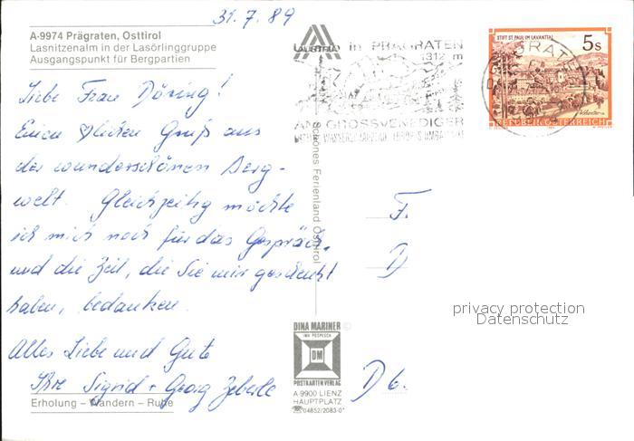 72498939 alte Postkarte Praegraten Grossvenediger Lasnitzenalm in der Lasoerlinggruppe postalisch gelaufen Erhaltung siehe scans KatCode: 11390333070723