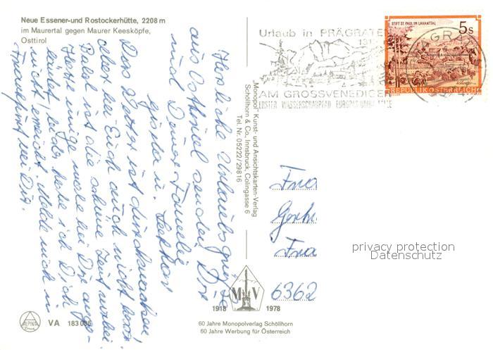73591920 alte Postkarte Praegraten Grossvenediger Neue Essener- und Rostockerhuette Maurertal gegen Maurer Keeskoepfe Venedigergruppe postalisch gelaufen Erhaltung siehe scans [FriedD77] KatCode: 11390333070723