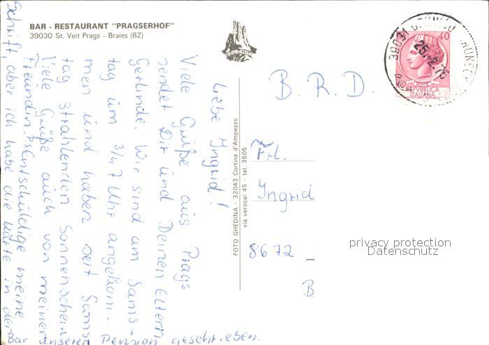 old postcard Prags Bar Restaurant Pragserhof postalisch gelaufen Erhaltung siehe scans [FriedD77]