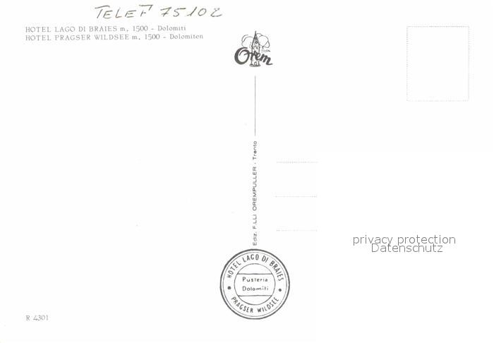 Pragser Wildsee Hotel Pragser Wildsee postalisch nicht gelaufen Erhaltung siehe scans [LiesaD40]