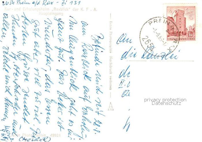 73237803 alte Postkarte Prein Rax Kur und Erholungsheim Raxblick Haupteingang postalisch gelaufen Erhaltung siehe scans [WerneD78] KatCode: 11390122031829