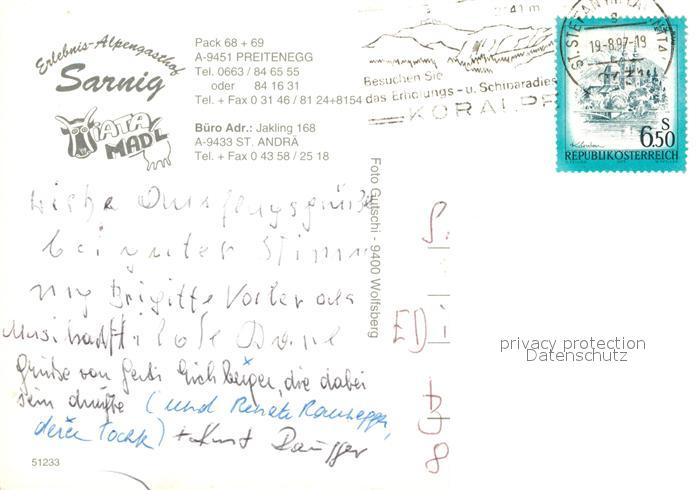 73304540 alte Postkarte Preitenegg Alpengasthof Sarnig Wintersportplatz Alpen postalisch gelaufen Erhaltung siehe scans [FriedD77] KatCode: 11390213020911
