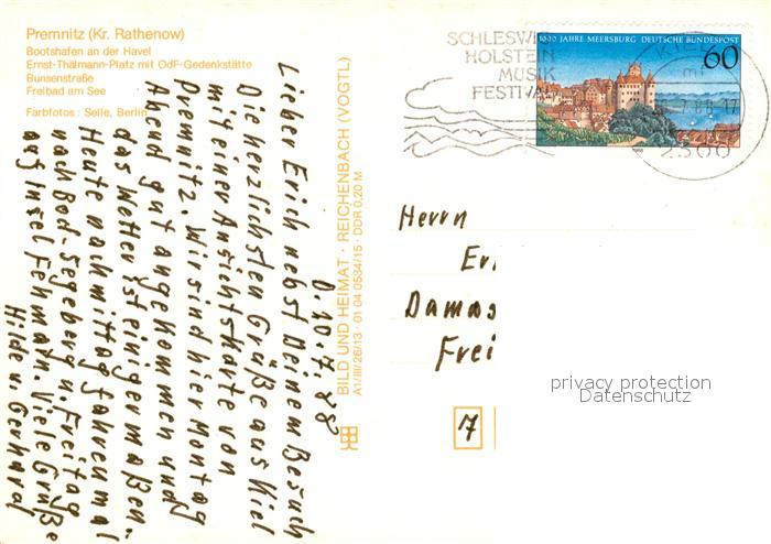 73480433 alte Postkarte Premnitz Bootshafen Ernst Thaelmann Platz OdF Gedenkstaette Freibad postalisch gelaufen Erhaltung siehe scans [KathaD81] KatCode: 11110012063244
