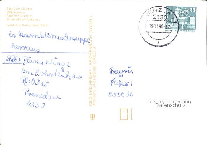 72413591 alte Postkarte Prenzlau Blick vom Steintor Mitteltorturm Blindower Torturm postalisch gelaufen Erhaltung siehe scans KatCode: 11110012073452