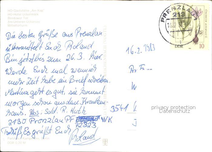 72374270 alte Postkarte Prenzlau HO Gaststaette Am Kap HO Hotel Uckermark Blindower Tor Uckersee Mitteltorturm postalisch gelaufen Erhaltung siehe scans KatCode: 11110012073452