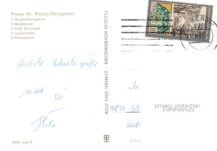73101414 alte Postkarte Prerow Ostseebad Hauptrettungsturm Cafe Strandeck Ladenstrasse Prerowstrom postalisch gelaufen Erhaltung siehe scans [KathaD81] KatCode: 11110013057068