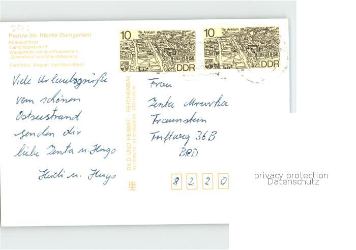 72202763 alte Postkarte Prerow Ostseebad Rohrdachhaus Campingplatz Wassertreter Prerowstrom Duenenhaus Strand postalisch gelaufen Erhaltung siehe scans KatCode: 11110013057068