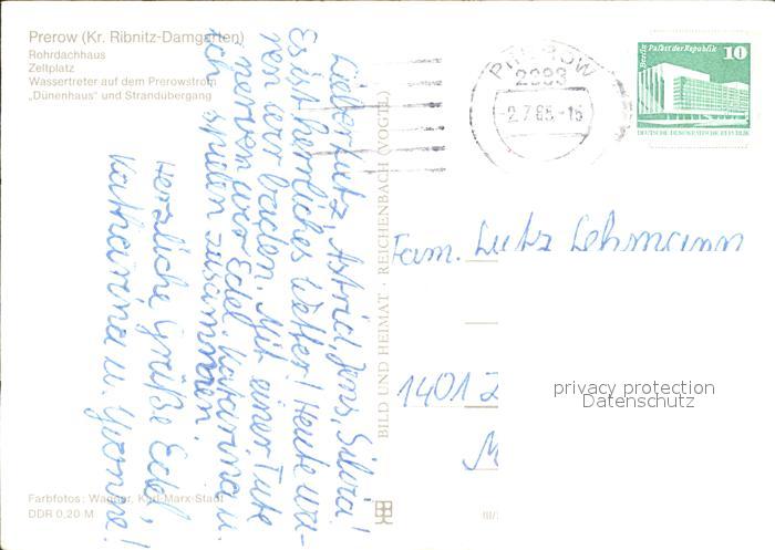 72374261 alte Postkarte Prerow Ostseebad Rohrdachhaus Zeltplatz Wassertreter Prerowstrom Duenenhaus Stranduebergang postalisch gelaufen Erhaltung siehe scans KatCode: 11110013057068