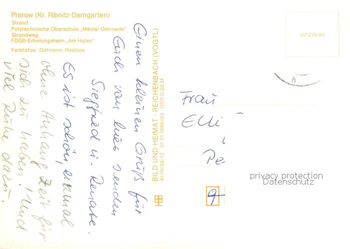 73867218 alte Postkarte Prerow Ostseebad Strand Polytech Oberschule Nikolai Ostrowski Strandweg FDGB Erholungsheim Am Hafen postalisch gelaufen Erhaltung siehe scans [WerneD78] KatCode: 11110013057068