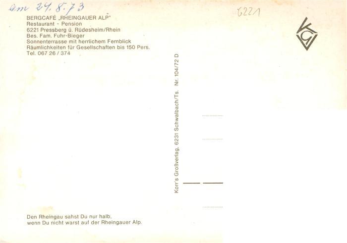 73935841 Presberg Rheingau Ruedesheim Bergcafe Rheingauer Alp postalisch nicht gelaufen Erhaltung siehe scans [WerneD78] KatCode: 11110006439013