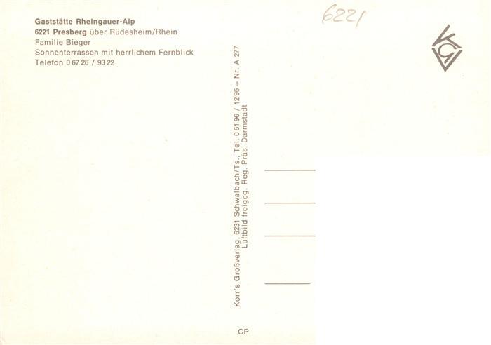 73889297 Presberg Rheingau Ruedesheim Gaststaette Rheingauer Alp postalisch nicht gelaufen Erhaltung siehe scans [WerneD78] KatCode: 11110006439013
