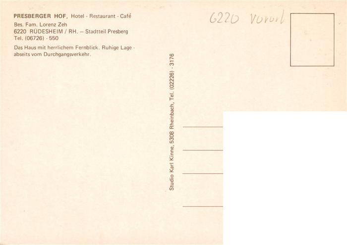 73936015 Presberg Rheingau Ruedesheim Hotel Restaurant Cafe Presberger Hof postalisch nicht gelaufen Erhaltung siehe scans [FriedD77] KatCode: 11110006439013