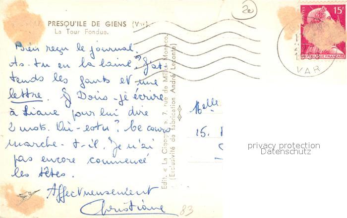 13484652 carte postale Presqu Ile-de-Giens La Tour Fondue Cote d Azur postalisch gelaufen Erhaltung siehe scans [FriedD77] KatCode: 11170083283069