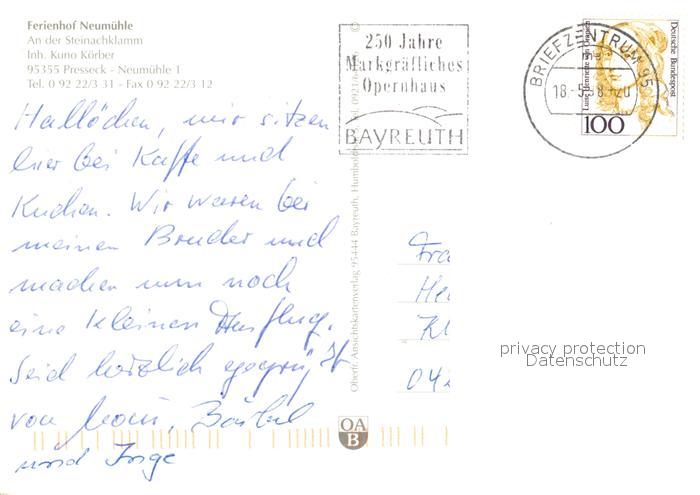 73050816 alte Postkarte Presseck Ferienhof Neumuehle Steinachklamm Wildenstein postalisch gelaufen Erhaltung siehe scans [KathaD81] KatCode: 11110009477148