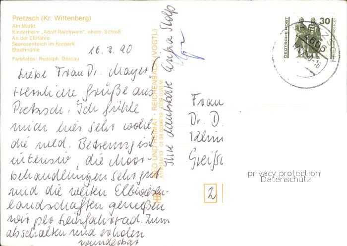 72374260 alte Postkarte Pretzsch Elbe Eisenmoorbad Markt Kinderheim ehem. Schloss Elbfaehre Seerosenteich Kurpark Stadtmuehle postalisch gelaufen Erhaltung siehe scans KatCode: 11110015091255