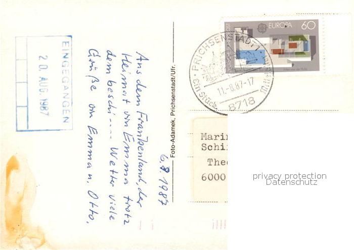 73214166 alte Postkarte Prichsenstadt Altstadt Fachwerkhaeuser Brunnen Westtor Stadttor postalisch gelaufen Erhaltung siehe scans [FriedD77] KatCode: 11110009675158