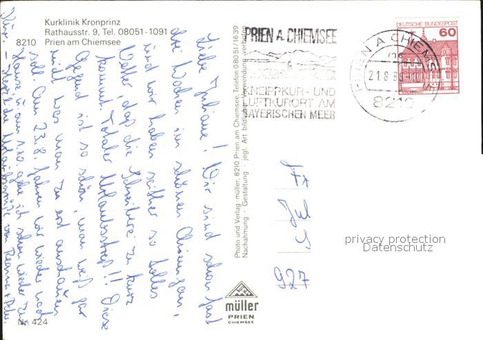 72448487 alte Postkarte Prien Chiemsee Fliegeraufnahme Kurklinik Kronprinz postalisch gelaufen Erhaltung siehe scans KatCode: 11110009187162