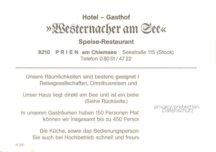 73720560 Prien Chiemsee Hotel Gasthof Westernacher Ansicht vom See aus Bootfahren postalisch nicht gelaufen Werbekarte (keine Postkarte) Erhaltung siehe scans [FriedD77] KatCode: 11110009187162