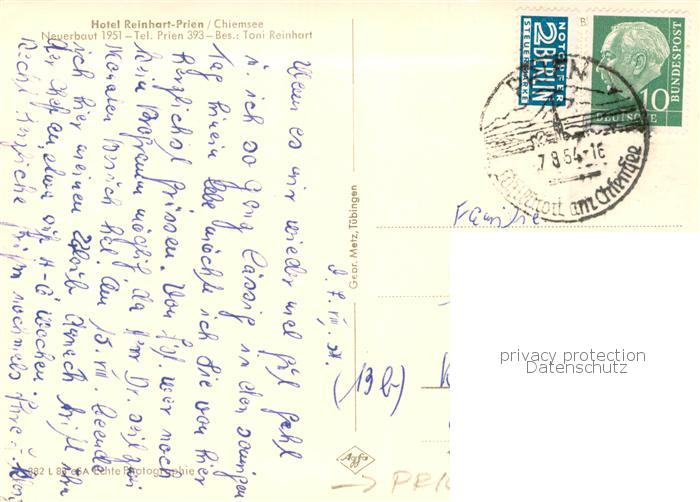 73792121 alte Postkarte Prien Chiemsee Hotel Reinhart-Prien Aussenansicht m. Chiemsee postalisch gelaufen Erhaltung siehe scans [LiesaD40] KatCode: 11110009187162