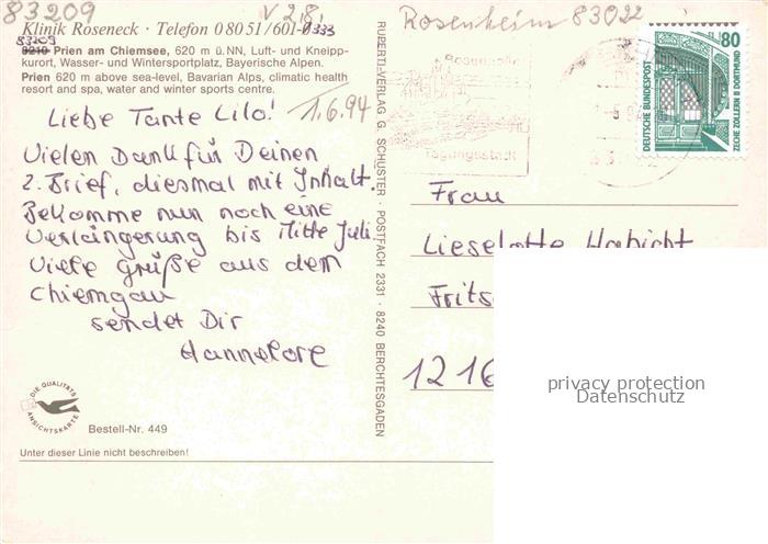 74040436 alte Postkarte Prien Chiemsee Klinik Roseneck postalisch gelaufen Erhaltung siehe scans [FriedD77] KatCode: 11110009187162