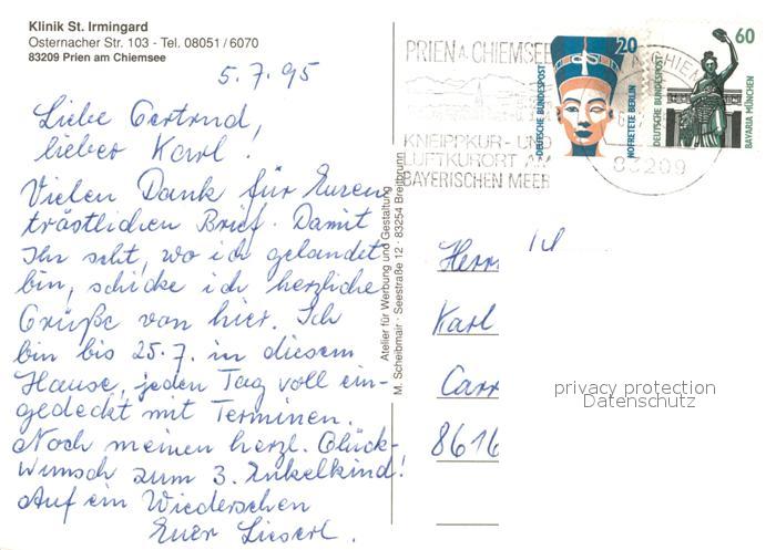 73167320 alte Postkarte Prien Chiemsee Klinik St Irmingard Alpen postalisch gelaufen Erhaltung siehe scans [FriedD77] KatCode: 11110009187162