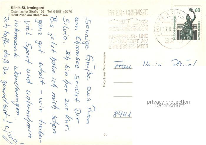 73756498 alte Postkarte Prien Chiemsee Klinik St. Irmingard Aussenansicht postalisch gelaufen Erhaltung siehe scans [LiesaD40] KatCode: 11110009187162