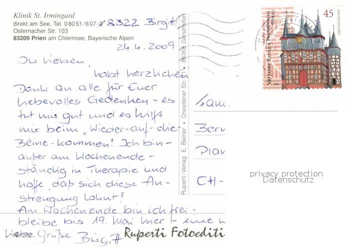 72770376 alte Postkarte Prien Chiemsee Klinik St Irmingard Bayerische Alpen postalisch gelaufen Erhaltung siehe scans [FriedD77] KatCode: 11110009187162