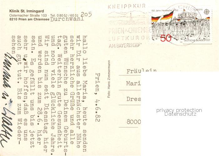 73829385 alte Postkarte Prien Chiemsee Klinik St Irmingard Park Radtour Bootsfahrt postalisch gelaufen Erhaltung siehe scans [FriedD77] KatCode: 11110009187162