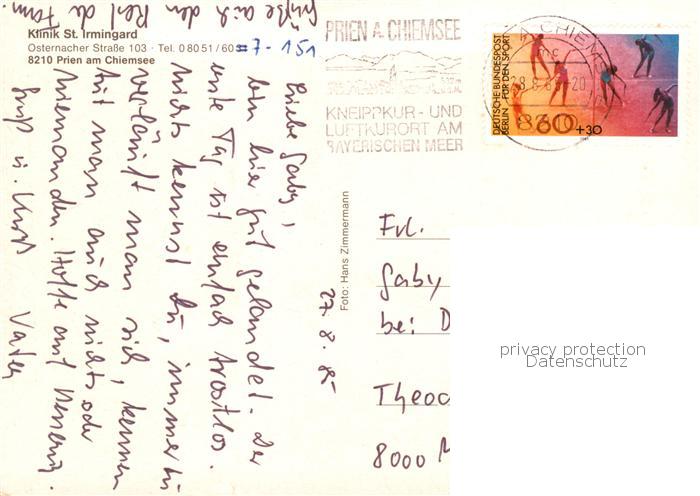 73837019 alte Postkarte Prien Chiemsee Klinik St Irmingard Radfahrer Gymnastik Bootspartie postalisch gelaufen Erhaltung siehe scans [FriedD77] KatCode: 11110009187162