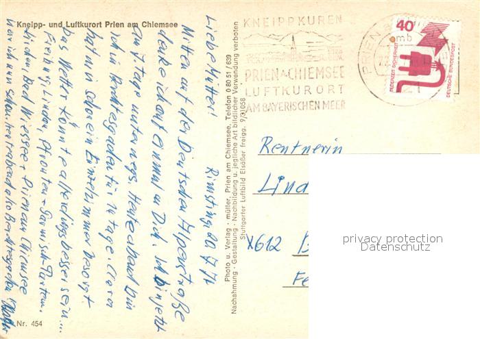 73667246 alte Postkarte Prien Chiemsee Kneipp- und Luftkurort Fliegeraufnahme postalisch gelaufen Erhaltung siehe scans [FriedD77] KatCode: 11110009187162