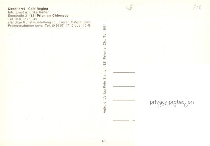 73569308 Prien Chiemsee Konditorei Cafe Regina postalisch nicht gelaufen Erhaltung siehe scans [PaolaD17] KatCode: 11110009187162