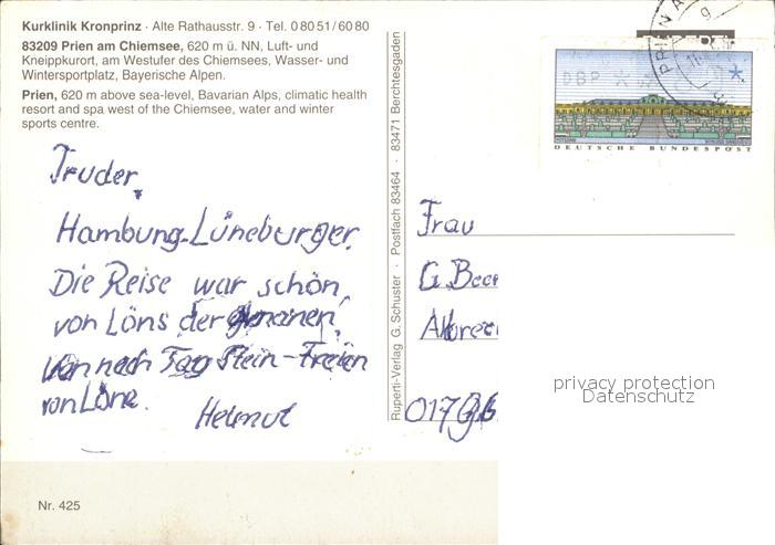 72523220 alte Postkarte Prien Chiemsee Kurklinik Kronprinz postalisch gelaufen Erhaltung siehe scans KatCode: 11110009187162