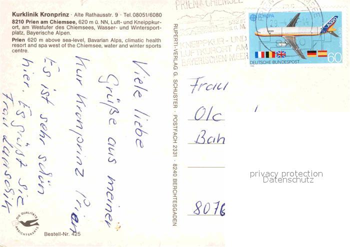 72905485 alte Postkarte Prien Chiemsee Kurklinik Kronprinz Kampenwand postalisch gelaufen Erhaltung siehe scans [NatalD47] KatCode: 11110009187162